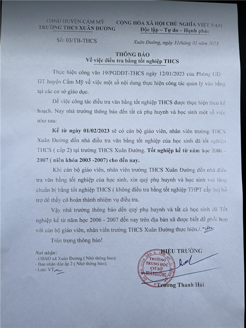 THÔNG BÁO ĐIỀU TRA BẰNG TỐT NGHIỆP TRUNG HỌC CƠ SỞ